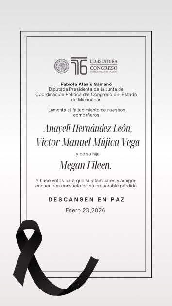 Morelia, Michoacán, a 23 de enero de 2026.- Las y los integrantes, así como el personal de la Junta de Coordinación Política del Congreso del Estado, que preside la diputada Fabiola Alanís, lamentan profundamente la muerte de dos intérpretes de Lengua de Señas Mexicana (LSM) que colaboraban en distintas dependencias, incluido el Poder Legislativo de Michoacán, así como de su hija menor de edad, quienes se encontraban desaparecidos desde el pasado 15 de enero.