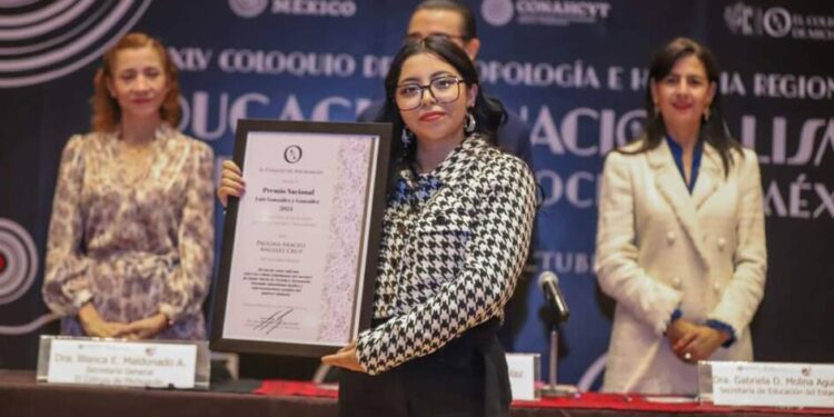 Junto al presidente del Colmich, Luis Alberto Arrioja Díaz, la secretaria de Educación destacó el trabajo de Magaly Alcántara, quien con su tesis “Mujeres, cristianismo y revolución”, fue acreedora de la mención honorífica entregada por el Colmich.